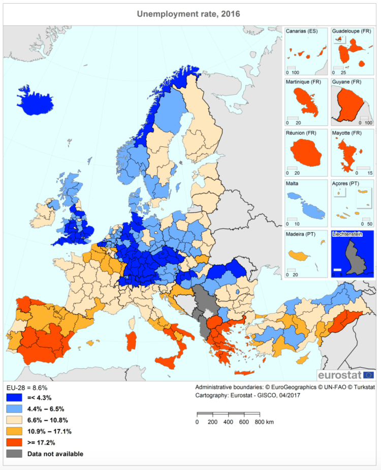 Chosen excerpts by Job Market Monitor. Read the whole story at Unemployment rates in the EU regions ranged from 2.1% to 31.3%