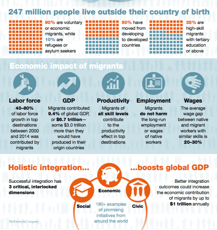 - Workers moving to higher-productivity settings boosts global GDP. MGI estimates that migrants contributed roughly $6.7 trillion, or 9.4 percent, to global GDP in 2015—some $3 trillion more than they would have produced in their origin countries. North America captured up to $2.5 trillion of this output, while up to $2.3 trillion went to Western Europe. Migrants of all skill levels make a positive economic contribution, whether through innovation, entrepreneurship, or freeing up natives for higher-value work.