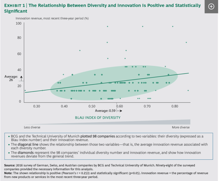 - The positive relationship between management diversity and innovation is statistically significant, meaning that companies with higher levels of diversity get more revenue from new products and services.