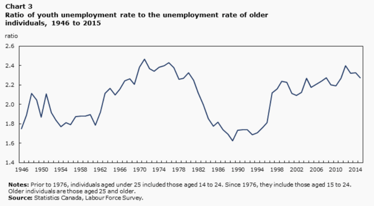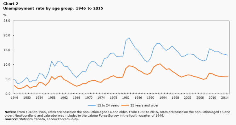 The result is that from 1946 to 2015, the youth unemployment rate followed similar patterns to the unemployment rate of older workers, but was always at least 1.6 times higher. The greatest disparities between the unemployment rates of youth and older workers occurred in the mid-1970s—when young people were just over 2.5 times as likely to be unemployed as older adults—and in 2012, when youth unemployment was 2.4 times higher than the rate for older workers.