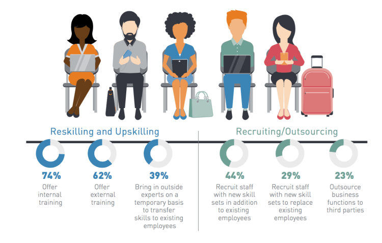 Almost three-quarters are investing in internal training to keep skills up to date, 44% are recruiting additional skillsets rather than replacing and more than a third are easing the transformation by bringing in contractors or third parties