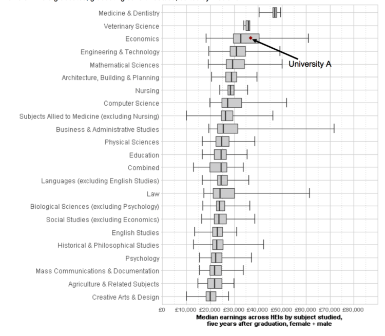 Figure 2: Distribution of median annualised earnings across HEIs for each subject area five years after graduation (minimum, lower quartile, median, upper quartile, maximum). ‘University A’ represents an example institution.