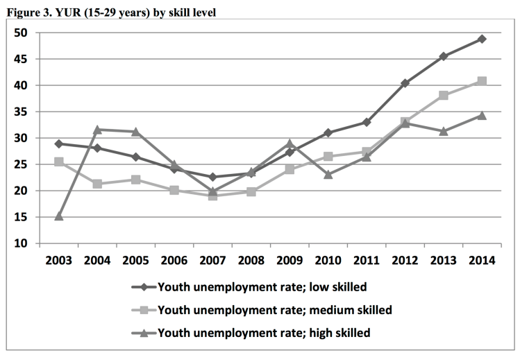 In the past two decades, there have been many reforms designed, on the one hand, to make the labor market more flexible by reducing hiring and firing costs, and, on the other hand, to a lesser extent, to make both secondary and tertiary education more inclusive and interlinked to the labour market. A number of different indicators point to a remarkable increase in wage, functional and numerical flexibility, also without considering the recent Jobs Act. The changes in the employment protection legislation have helped slightly reducing the youth unemployment rate, but have not succeeded in smoothing the overall school-to-work transition system that remains one of the slowest and most sluggish in the world. This also explains why in Italy, as in other Latin Rim countries, the disadvantage of the young compared to adults is constantly high.