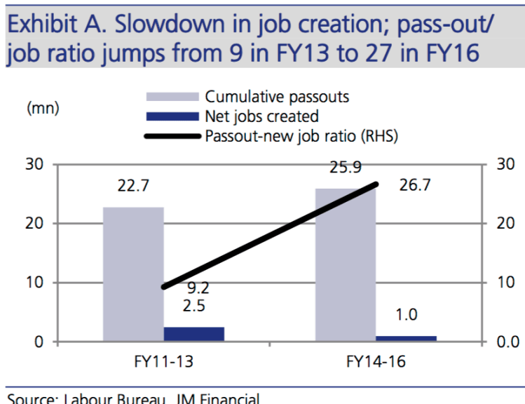 Based on the quarterly employment survey and RBI’s data on banking employment, a total of 2.5 mn jobs had been created in nine labour intensive sectors that contribute to over 65% of the GDP in the three year period FY11-13 while 22.7 mn people earned higher education degrees in the same period (a ratio of 9 students per new job created). In the following three year period FY13-15, the corresponding numbers stood at 1 mn jobs and 25.9 mn with higher degrees (a ratio of 27 students per job created, more than 3x the previous period). According to the new quarterly employment series, a total of 0.19 mn jobs (excl. banks) were created in the first nine months of FY17 while 8.8 mn students passed out in FY16. The rate of supply of labour has far exceeded that of demand. Especially of concern is that textiles, IT/BPO and banks, which have contributed to about 90% of these new jobs, are exhibiting signs of increasing sluggishness. The misalignment between the education imparted and high growth areas of job creation further complicates the problem.