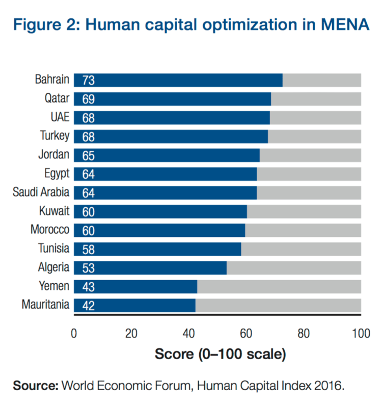 • The World Economic Forum’s Human Capital Index— which measures the extent to which countries and economies optimize their human capital potential through education and skills development and its deployment throughout the life-course—finds that the Middle East and North Africa (MENA) region as a whole currently only captures 62% of its full human capital potential (compared to a global average of 65%).
