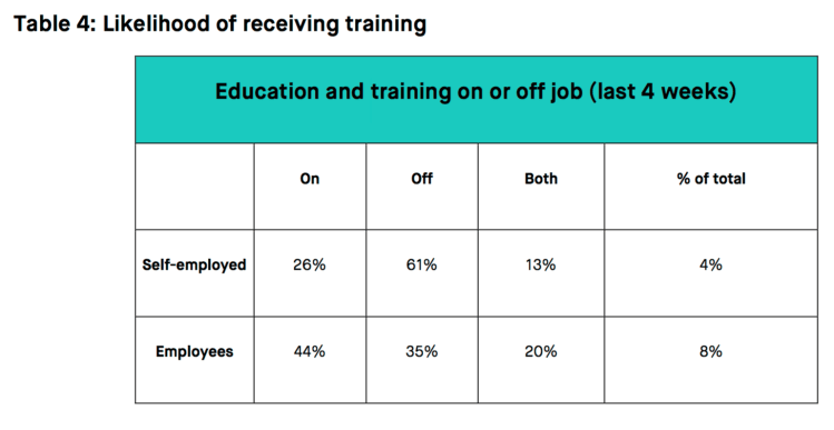 Self-employed are less likely to receive training: only half as likely as employees. - They take fewer days off sick: half as likely to take sick days.