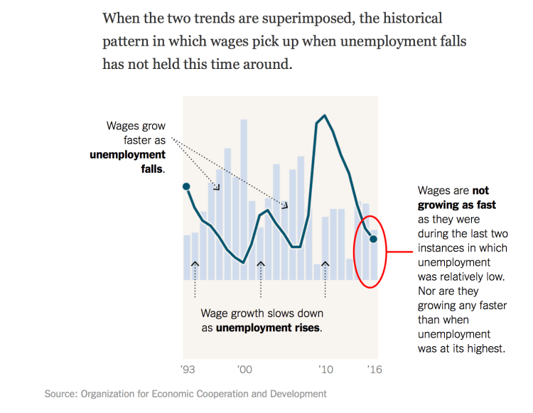 But other economists assert that the weak growth in wages is an indicator of a new economic order in which working people are at the mercy of their employers. Unions have lost clout. Companies are relying on temporary and part-time workers while deploying robots and other forms of automation in ways that allow them to produce more without paying extra to human beings. Globalization has intensified competitive pressures, connecting factories in Asia and Latin America to customers in Europe and North America.