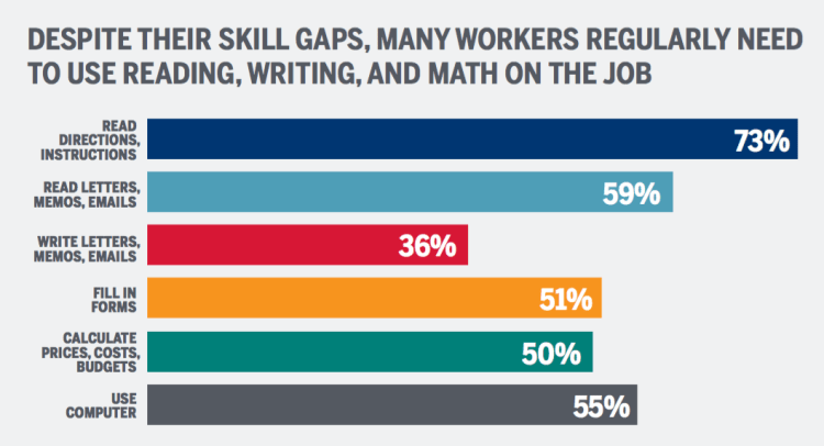 In the course of their jobs, these workers o en need to read vital directions, follow safety protocols, calculate prices, supervise colleagues, and oversee budgets. All of these tasks are made dramatically more challenging for workers who don’t have strong literacy or numeracy skills. Many resort to creative work-arounds in an attempt to compensate for their lack of skills, but others struggle in silence. Their skill gaps carry heavy consequences for themselves, their co-workers, their employers, and our society as a whole.