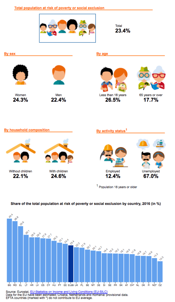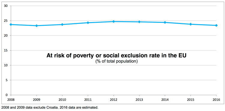 In 2016, 117.5 million people, or 23.4% of the population, in the European Union (EU) were at risk of poverty or social exclusion. This means that they were in at least one of the following three conditions: at-risk-of-poverty after social transfers (income poverty), severely materially deprived or living in households with very low work intensity. After three consecutive increases between 2009 and 2012 to reach almost 25%, the proportion of persons at risk of poverty or social exclusion in the EU has since continuously decreased to 23.4% last year, only 0.1 percentage points above its 2009 low-point. The reduction of the number of persons at risk of poverty or social exclusion in the EU is one of the key targets of the Europe 2020 strategy.