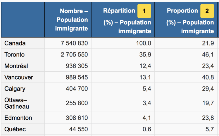 Selon une compilation spéciale du Moniteur de l’emploi à partir des données du recensement de 2016 publiées aujourd’hui par Statistique Canada, 1 091 305, soit 13,7% de population du Québec ont déclaré être, ou avoir déjà été, un immigrant reçu ou un résident permanent au Canada la journée du recensement.