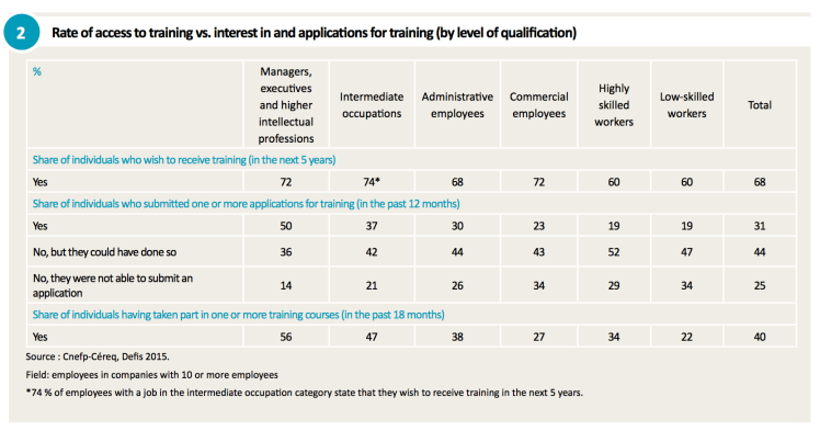 The DEFIS surveys provide a means of capturing employees’ career aspirations in all their diversity. Those aspirations can be compared not only with employees’ interest in receiving training as expressed in applications submitted but also with their career situation and prospects and the context of the company in which they work. However, employees’ interest in training and the applications submitted emerge as two distinct realities. While the majority of employees express a desire to take part in training within the next ve years, with few di erences between the various skill levels, only 31% of employees submitted applications for training over the past year and those applications are very unequally distributed.