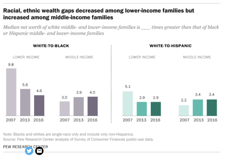 The Great Recession of 2007-2009 triggered a sharp, prolonged decline in the wealth of American families, and an already large wealth gap between white households and black and Hispanic households widened further in its immediate aftermath. But the racial and ethnic wealth gap has evolved differently for families at different income levels, according to a new Pew Research Center analysis of data from the Federal Reserve Board’s Survey of Consumer Finances.