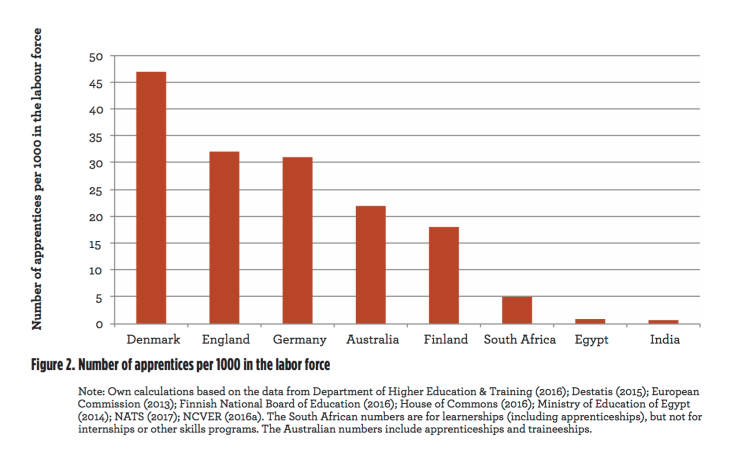 This report presents the results of the analysis of apprenticeship in eight countries: Australia, Denmark, Egypt, England, Finland, Germany, India, and South Africa. The study used documentary analysis as its central methodological approach, citing, summarizing, synthesizing, analyzing and critically reflecting on existing literature and data produced by international organizations, government agencies, universities, and research institutions.