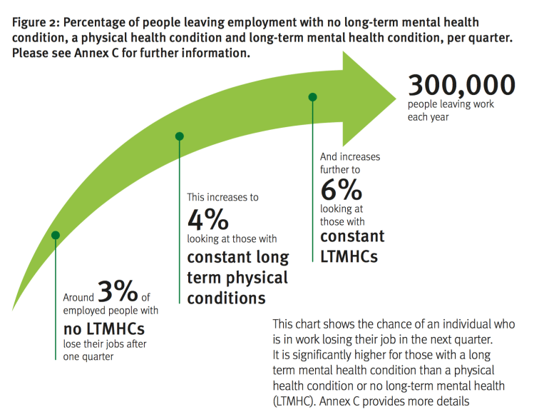 • While there are more people at work with mental health conditions than ever before, 300,000 people with a long term mental health problem lose their jobs each year1, and at a much higher rate than those with physical health conditions.