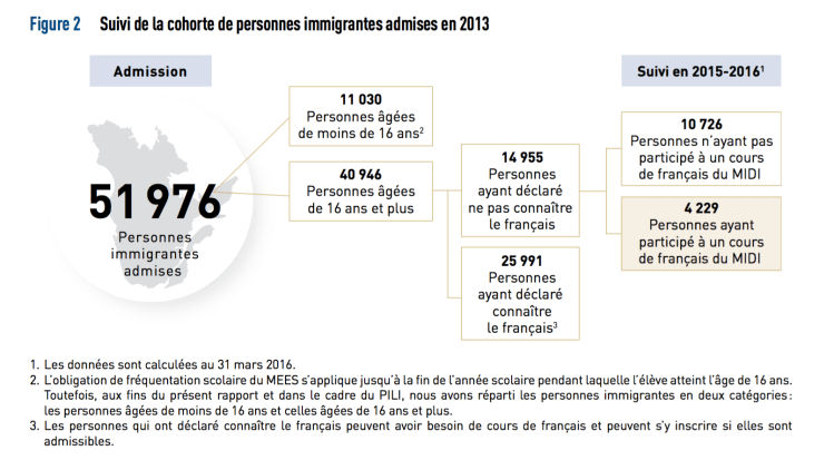 - Le MIDI n’effectue aucun suivi individuel des personnes immigrantes qui ont déclaré ne pas connaître le français et qui n’ont pas participé à des cours du ministère. Seulement le tiers des personnes immigrantes admises au Québec de 2010 à 2013 qui ont déclaré ne pas connaître le français au moment de leur admission ont participé à des cours de français du MIDI. De plus, plusieurs personnes se désistent des cours du ministère sans que ce dernier fasse de suivi à cet égard.