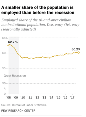 - A smaller share of Americans are in the labor force. In December 2007, two-thirds (66.0%) of civilians ages 16 and over either were employed or actively looking for work; as of October of this year, only 62.7% were. The labor force participation rate, as it’s called, fell steadily throughout the Great Recession and well into the subsequent recovery. It bottomed out at a seasonally adjusted 62.4% in September 2015 and has risen only slightly since then.