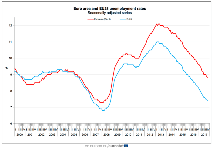 The euro area (EA19) seasonally-adjusted unemployment rate was 8.8% in October 2017, down from 8.9% in September 2017 and from 9.8% in October 2016. This is the lowest rate recorded in the euro area since January 2009. The EU28 unemployment rate was 7.4% in October 2017, down from 7.5% in September 2017 and from 8.3% in October 2016. This is the lowest rate recorded in the EU28 since November 2008. These figures are published by Eurostat, the statistical office of the European Union.