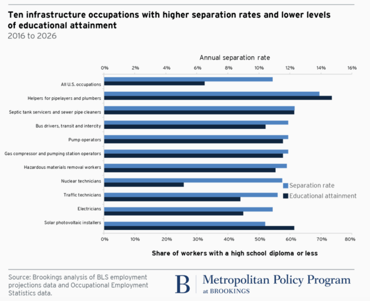 As shown in the chart below, a variety of different occupations – from septic tank servicers and sewer pipe cleaners to bus drivers and electricians – are not only projected to have higher separation rates compared to all U.S. jobs, but they also tend to employ workers with only a high school diploma or less. At the same time, some occupations, such as helpers for pipelayers and plumbers, offer clearer pathways to additional training and skills development; other occupations, such as solar photovoltaic installers, are also projected to surge in importance and offer expanded employment opportunities.