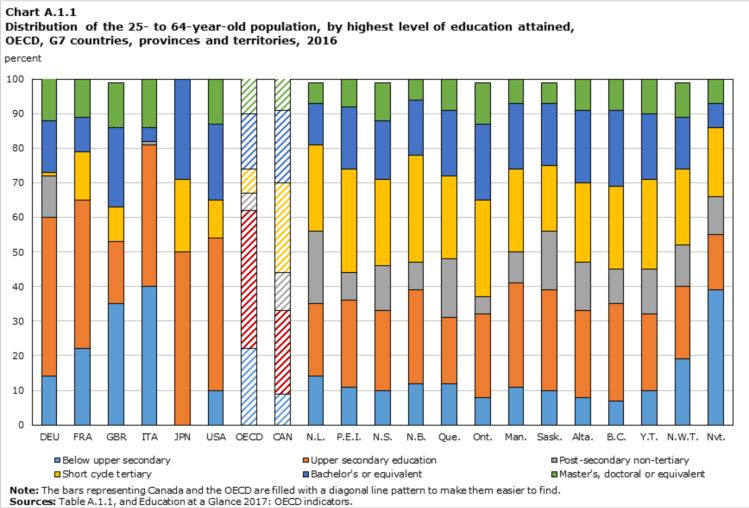 - In 2016, one-quarter (26%) of 25- to 64-year-olds in Canada had completed short cycle tertiary education, far greater than the average of 8% reported by the OECD.