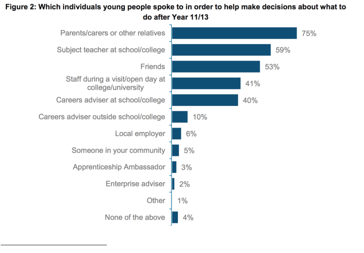 • Young people most commonly turn to ‘informal sources’ including parents/carers, teachers and friends. Although more limited use is made of careers advisers and local employers, those who do consult them find them useful.