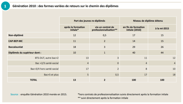 13 % des jeunes sortis de formation initiale en 2010 ont obtenu un nouveau diplôme dans les 5 années qui ont suivi. Ce phénomène, en augmentation constante, témoigne de la valeur que familles, jeunes et institutions continuent d’accorder au diplôme ; il interroge par ailleurs l’étanchéité de la frontière entre formation initiale et continue. 43 % de ces nouveaux diplômes sont obtenus en alternance (apprentissage ou contrat de professionnalisation).