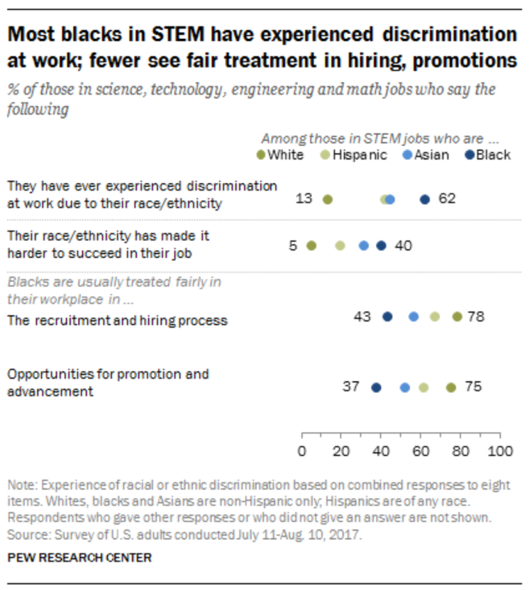 Roughly six-in-ten black STEM workers (62%) say they have experienced any of eight specific forms of racial or ethnic discrimination at work, from earning less than a coworker who performed the same job to experiencing repeated, small slights at work. That compares with 44% of Asians, 42% of Hispanics and just 13% of whites in STEM jobs, according to the survey, which was conducted in the summer of 2017.