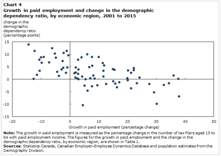 This article in the Economic Insights series assesses the degree to which changes in labour demand affect the working-age population and the regional demographic dependency ratio, based on a range of administrative data and Statistics Canada’s population estimates. The results suggest that over periods of seven years, a 5.0% decline in regional labour demand reduces the regional population aged 15 to 64 by 4.5% to 6.0%. Because working-age individuals are leaving economically declining regions, a 5.0% decline in labour demand raises the demographic dependency ratio (the number of youth and seniors divided by the number of individuals aged 15 to 64) by between 1.1 and 1.5 percentage points, from a baseline rate of roughly 50.0%.