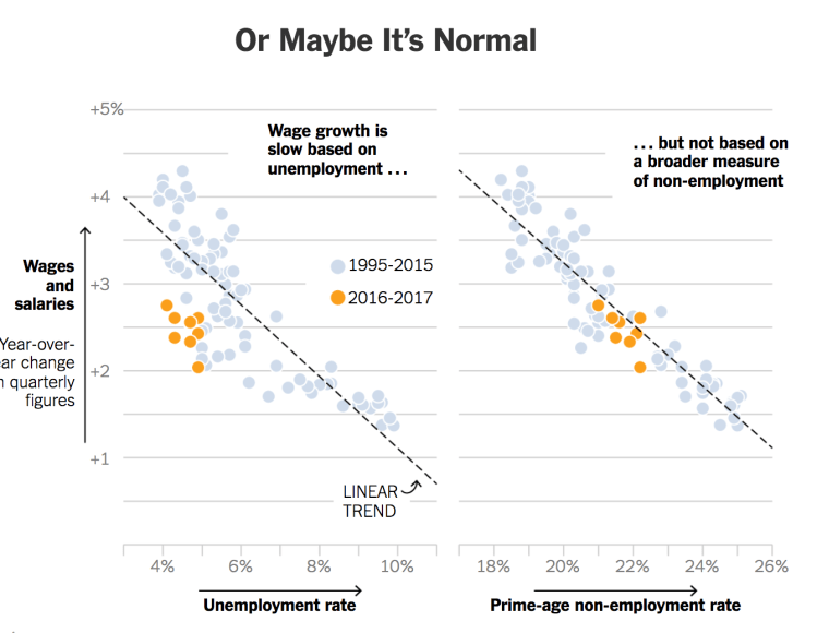 As the economy improves, more may come off the sidelines. But as economists at the Federal Reserve Bank of San Francisco recently argued, that could make overall wage growth look worse, because people entering the labor force usually earn relatively low salaries. The country’s aging population could also be a factor, because retiring baby boomers (who, on average, earn relatively high wages) are gradually being replaced by millennials (who generally earn less).