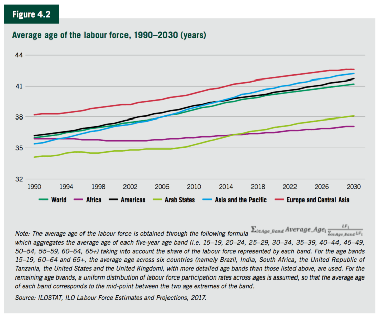 Meanwhile, population ageing will inevitably lead to an increase in the average age of those in the labour force, challenging workers’ ability to keep up with the pace of innovation and structural changes in the labour market. Globally, the average age of the labour force is expected to rise from nearly 40 in 2017 to 41 in 2030, growing considerably faster in Europe and Eastern Asia, notably China.