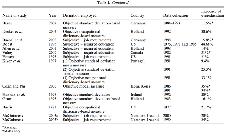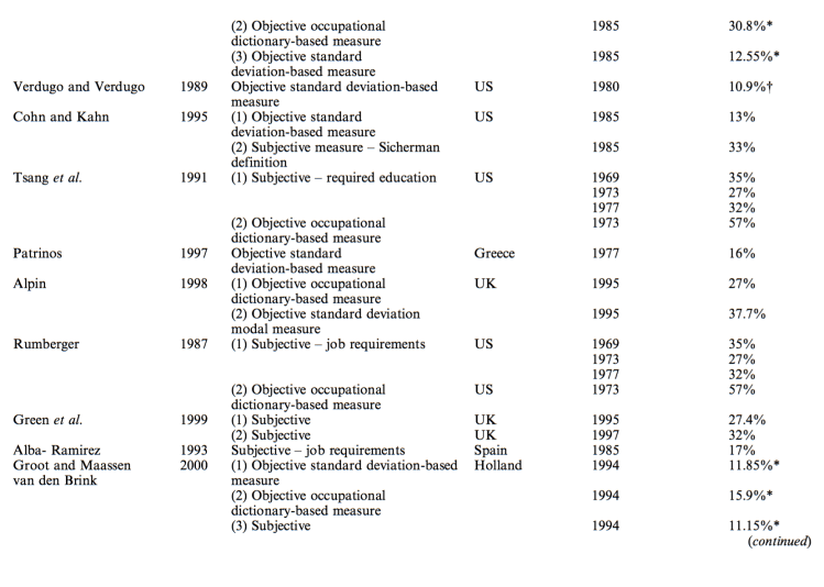 The various incidence estimates from the raft of overeducation studies are summarized in Table 2. In total, 33 studies generated 62 estimates with the number of subjective and objective estimates relatively evenly split at 34 and 28 respectively.