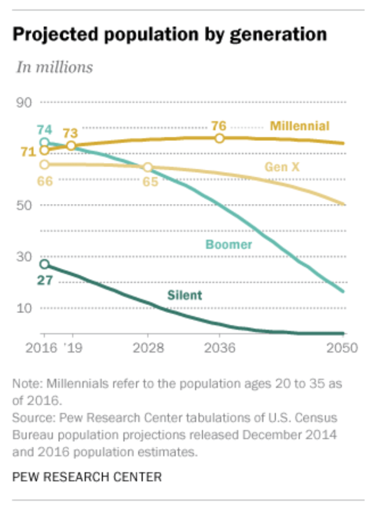 nation’s largest living adult generation, according to population projections from the U.S. Census Bureau. As of July 1, 2016 (the latest date for which population estimates are available), Millennials, whom we define as ages 20 to 35 in 2016, numbered 71 million, and Boomers (ages 52 to 70) numbered 74 million. Millennials are expected to overtake Boomers in population in 2019 as their numbers swell to 73 million and Boomers decline to 72 million. Generation X (ages 36 to 51 in 2016) is projected to pass the Boomers in population by 2028.