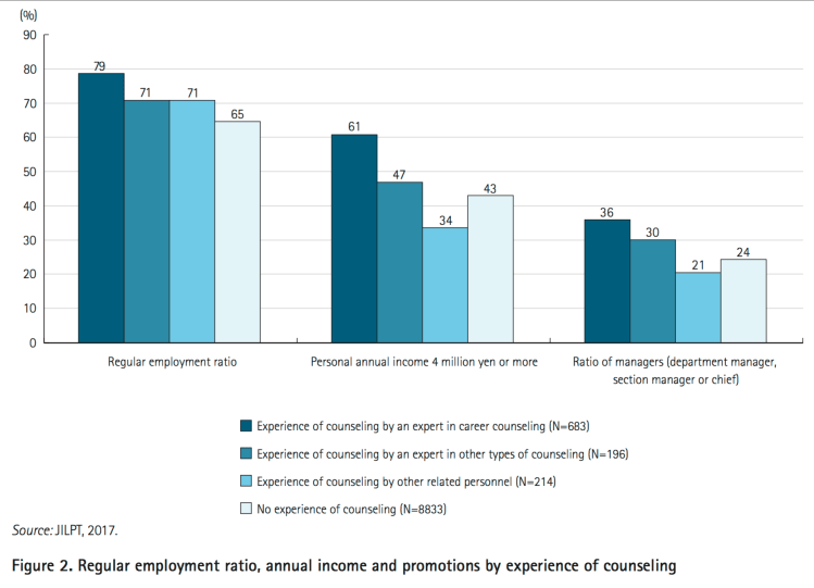 As shown in Figure 2, a high ratio of persons with experience of counseling by counseling experts in career were currently working as regular employees, and a high ratio of them had an annual personal income of 4 million yen or more. A high ratio of those working in an organization had also experienced promotions.