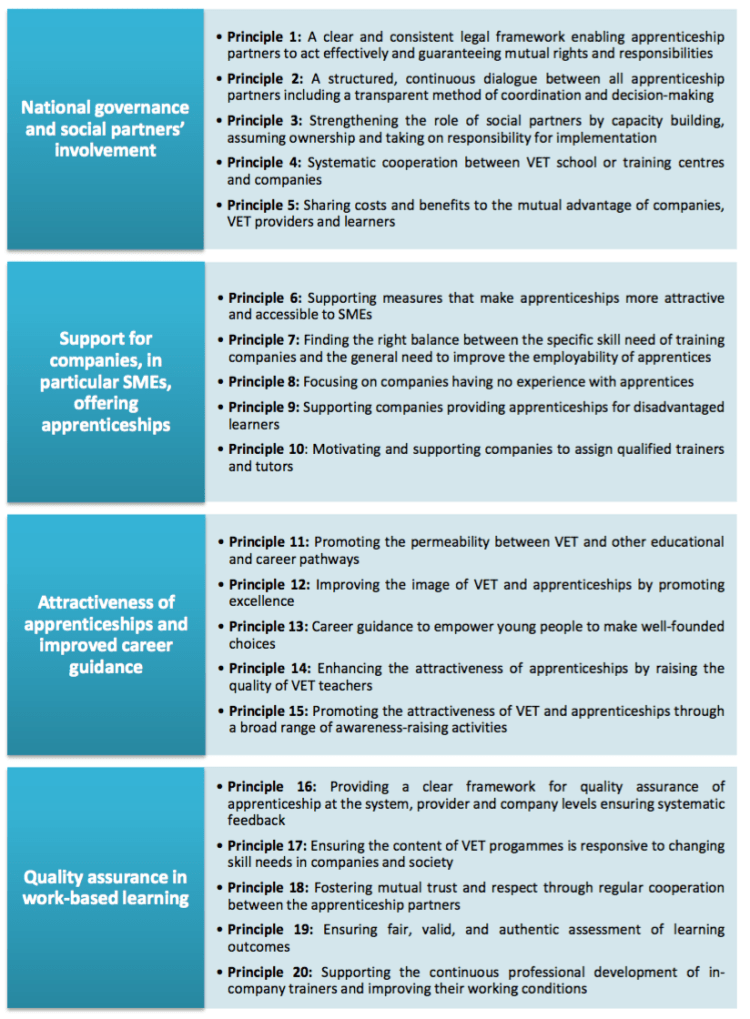 This document presents 20 guiding principles developed by the ET 2020 Working Group on Vocational Education and Training (WG on VET) in 2014-2015. These principles were developed during a series of meetings, in-depth country focus workshops and webinars.