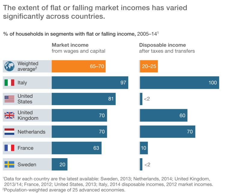 For large shares of the population in the advanced economies, there has really been no positive movement or no sense of progress in terms of where their incomes have gone over the last one to two decades. When we looked at the data across the US as well as a set of European economies, we found that for as many as two-thirds of households at the level of market income, which is what they earn mainly from wages, incomes were flat or falling (Exhibit 1). Even after taking into account transfers that they received from their governments, there was still something like 25 percent of the population that didn’t progress and, in fact, had fallen behind.