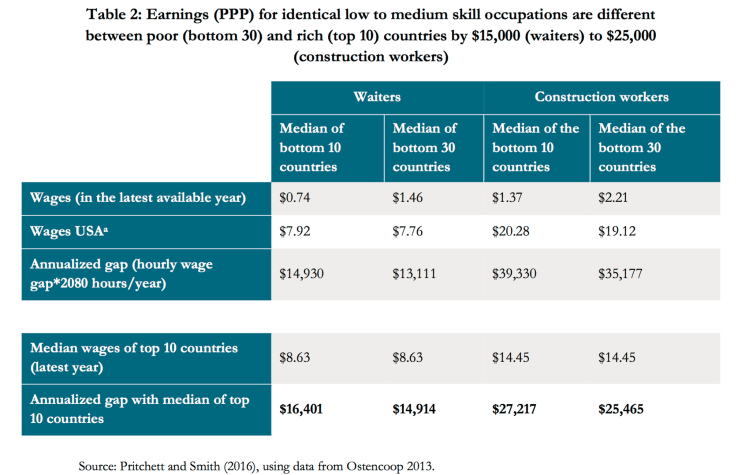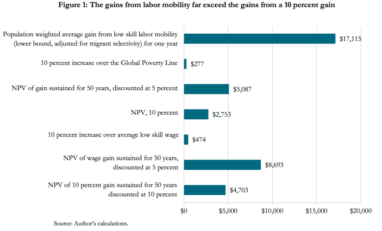 A large part of the explanation of differences in labor productivity across countries is differences in “A”—total factor productivity. Transmitting A from country to country has proven difficult. This implies that labor with the exact same intrinsic productivity will have much higher productivity (and hence justify a higher wage) in a high A than in a low A country. But, by and large, rich countries have passed extraordinarily strict regulations on the movement of unskilled labor. A relaxation of these restrictions could produce the largest single gains in global poverty of any available policy, program or project action. And since these gains to movers are (mostly) due to higher A which (at the margin) is a “public good” (it is non-rival and non-excludable) in the host country these gains are essentially free to the host country (or could be free to the host country under some technical design conditions).
