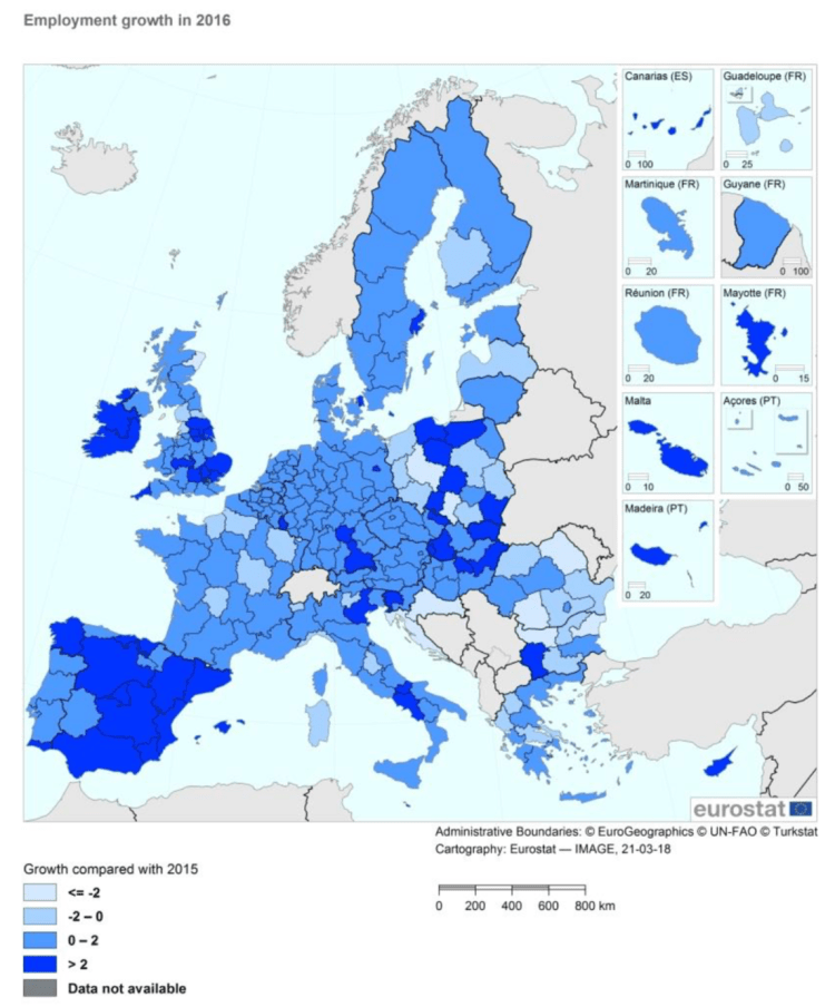 In the EU as a whole, the employment grew by 1.2% in 2016.