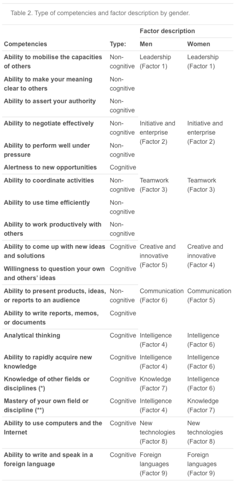 Although our results should be interpreted cautiously insofar as we cannot derive casual effects on the relationship between the competencies and labour market outcomes of European graduates, some relevant issues can be highlighted. Non-cognitive skills appear to be much more associated with graduates’ occupational status, especially with managerial occupations, than cognitive skills. Gender differences become apparent when looking at the specific competencies: leadership abilities seem to be more important among males working as managers, while females employed in such positions display higher levels of initiative and enterprise skills. In addition, it should be noted that the variety of competencies that are relevant for women in order to be employed as professionals, and especially as managers, is broader than that for men, thus suggesting that the labour market is tougher with regard to women’s competencies and skills. In contrast, cognitive abilities seem to be more rewarded in terms of earnings. Again, our results provide evidence of differences between males and females. Competencies associated to intelligence are associated with higher wages in the three occupational groups considered in our analysis only for males. Other types of cognitive abilities are also related to higher earnings among males employed as technicians and associate professionals. This is the case of new technologies and foreign language skills. In contrast, none of the identified factors that comprise cognitive abilities are statistically associated with women’s wages.