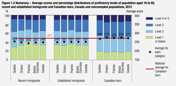 - When literacy, numeracy, and PS-TRE are measured in either English or French, on average, recent and established immigrants both show lower proficiency scores than the Canadian-born in all three skills. However, recent immigrants and established immigrants have similar average proficiency scores in the three skills.