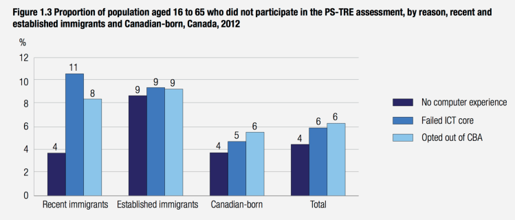 - Sizable proportions of recent and established immigrants (23 per cent and 27 per cent, respectively, versus 14 per cent for the Canadian-born) did not participate in the PS-TRE test for one of three reasons: no computer experience, failing the screening Information and Communications Technology (ICT) core test, or opting out of the computer-based assessment. The percentage of non-participation is highest among immigrants of the refugee class (38 per cent and 36 per cent, respectively, for recent and established immigrants).