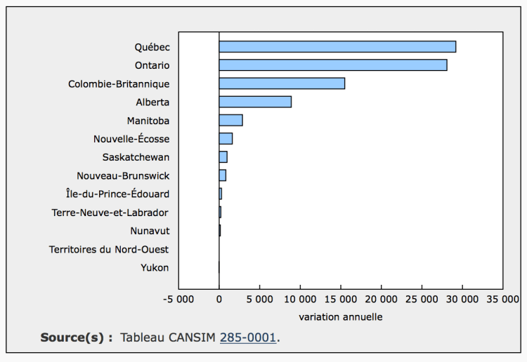 Au quatrième trimestre, les employeurs du Québec ont déclaré 29 000 (+46,1 %) postes vacants de plus qu’au même trimestre un an plus tôt. Les hausses du nombre de postes vacants étaient généralisées dans l’ensemble des secteurs d’activité, notamment dans les secteurs de la fabrication, des services d’hébergement et de restauration, et de la finance et des assurances. Le taux de postes vacants dans cette province a augmenté de 0,8 point de pourcentage pour se situer à 2,6 %, ce qui constitue la hausse la plus forte parmi l’ensemble des provinces. La plupart des régions économiques (RE) de la province ont enregistré des augmentations notables d’une année à l’autre de leur taux de postes vacants, y compris la RE de Chaudière-Appalaches, où le taux a augmenté de 1,7 point de pourcentage pour atteindre 3,3 %, et celle de la Capitale-Nationale, où le taux a augmenté de 1,4 point de pourcentage pour s’établir à 3,1 %. Dans ces deux RE, le taux de postes vacants a connu une hausse notable dans le secteur de la fabrication et dans celui des services d’hébergement et de restauration. Au cours de la même période, selon les données de l’Enquête sur la population active (EPA), le taux de chômage au Québec a diminué de 1,1 point de pourcentage pour s’établir à 5,5 %, comparativement à un taux national de 6,0 %.
