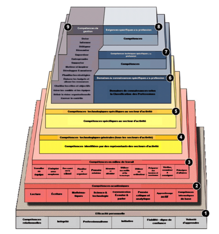 Adaptation et traduction libres du Moniteur de l’emploi à partir de http://www.careeronestop.org/CompetencyModel/pyramid_definition.aspx (1) OCDE : LA DÉFINITION ET LA SÉLECTION DES COMPÉTENCES CLÉS, (2001) D.S. Rychen et L.H. Salganik (éd.), http://www.oecd.org/edu/statistics/deseco