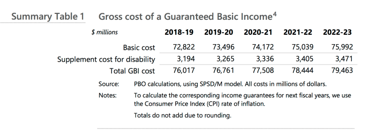 PBO forecasts that more than 7.5 million people would benefit from the basic cost of GBI. Thus, on a per capita basis, the annual cost would range between $9,421 and $10,169 for the period 2018-2023.