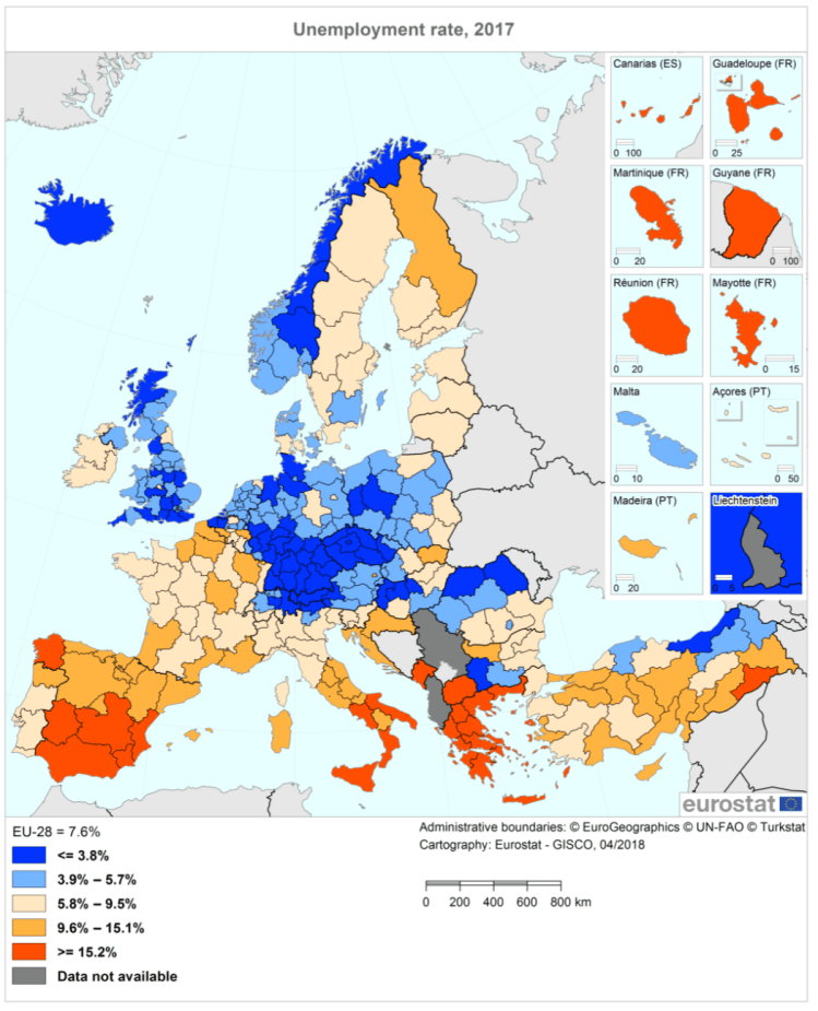 Chosen excerpts by Job Market Monitor. Read the whole story at Unemployment rates in the EU regions ranged from 1.7% to 29.1%