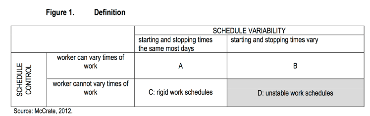 Unstable work schedules are schedules in which the times of work vary and workers have little or no control over that variability, either as individuals or through collective agreements. These schedules are also often called “just-in-time” schedules. Their main attraction for employers is flexibility: the ability to respond to changes in demand and other contingencies, measured in small intervals of time. However, such scheduling practices often impose significant costs on workers, including the difficulty of planning and coordinating non-market times with others when the specific times of work vary, and the instability of income when total hours vary and workers are paid by the hour.