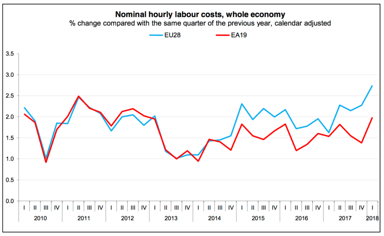 Hourly labour costs rose by 2.0% in the euro area (EA19) and by 2.7% in the EU28 in the first quarter of 2018, compared with the same quarter of the previous year. In the fourth quarter of 2017, hourly labour costs increased by 1.4% and 2.3% respectively. These figures are published by Eurostat, the statistical office of the European Union.
