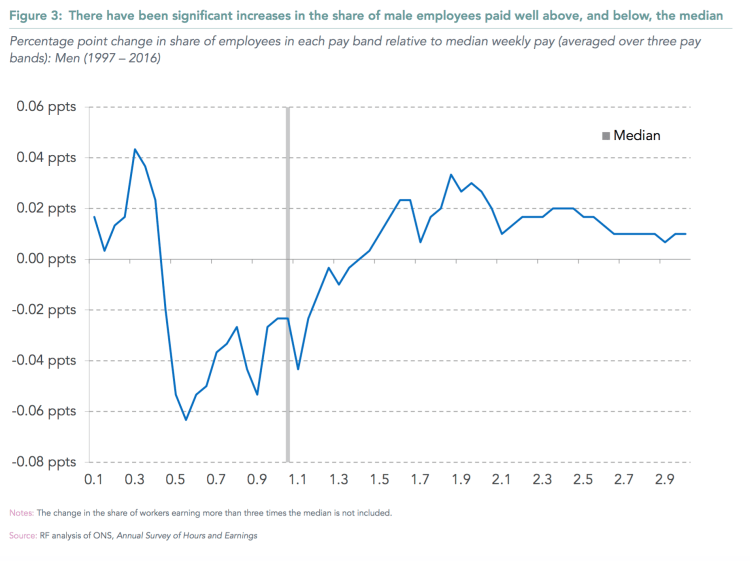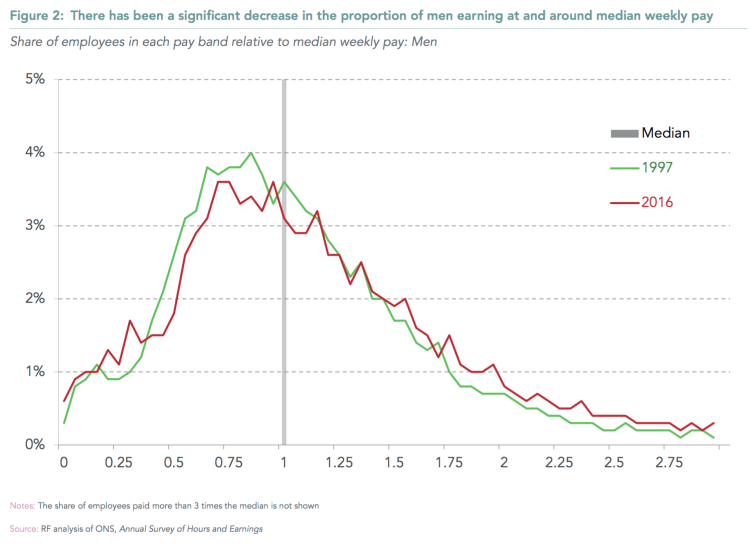 The pay of Britain’s workers has rarely been out of the news in the past decade. The unprecedented squeeze on earnings that followed the financial crisis, a new minimum wage for those 25 and over, and the arrival of the “top 1 per cent” in the years leading up to the financial crisis have all rightly grabbed headlines. Another area of concern has been the idea that the UK is experiencing a ‘hollowing’ out of the pay distribution as offshoring and automation diminish the number of mid-paid jobs.