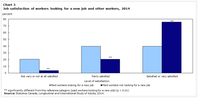 - Among workers dissatisfied with their current job, the probability of looking for a new job was more than 40% for both men and women, even after taking other factors associated with the job search into account. The same probability was 6% among those who were satisfied or very satisfied with their job.