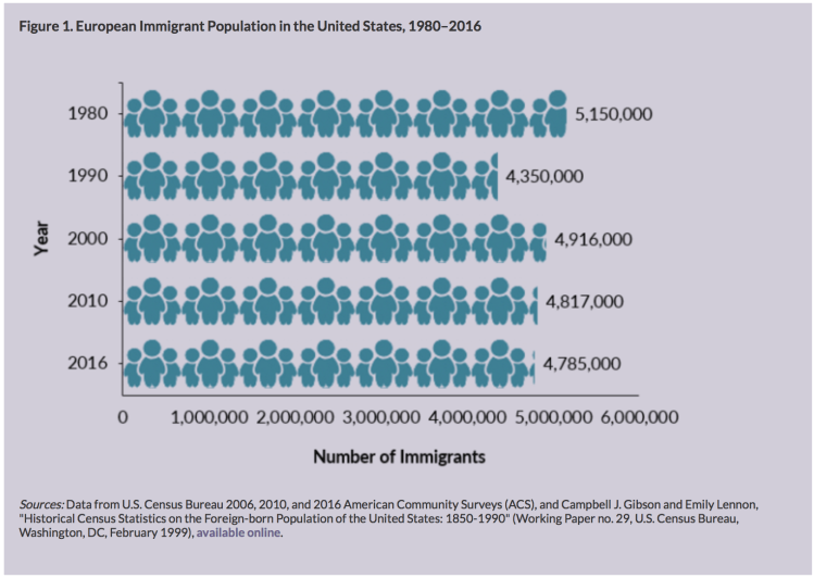 European immigrants in the United States have largely dwindled in number since 1960, after historically making up the bulk of immigration to the country. Today, immigrants from Eastern Europe account for the largest share of European arrivals, and Europeans overall are much older and more educated than the total foreign- and native-born populations. This article explores the data on Europeans in the United States.