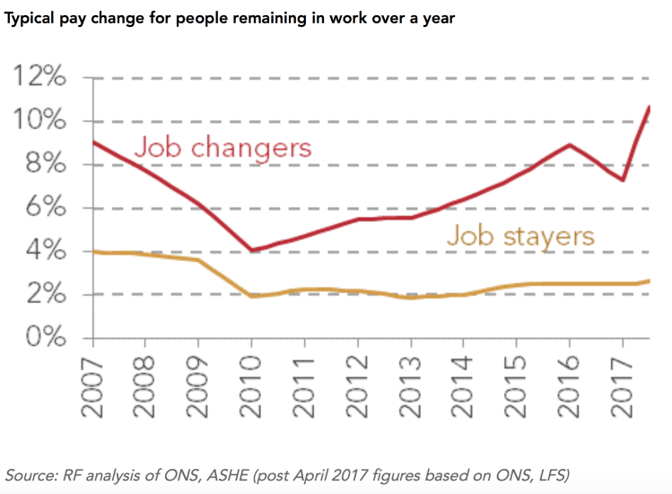 The typical pay rise for someone switching jobs is, on average, around 2.5 times higher than for someone remaining in the same job. Furthermore, pay growth for those switching jobs is back at pre-crisis levels, whereas the typical pay rise for those staying in the same job is still around a third lower than it was in 2007 and 2008.