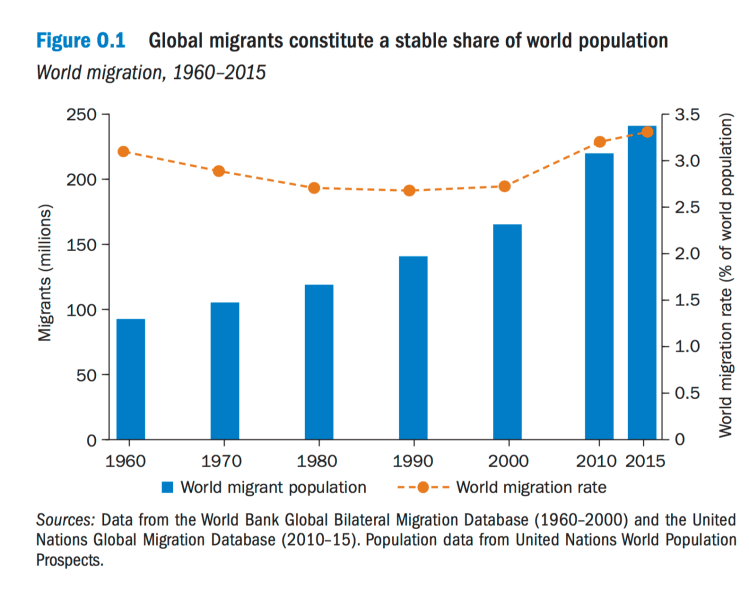 Despite the lure of higher wages, rates of migrants as a share of the global population have remained mostly unchanged for more than five decades, even as global trade and investment flows have expanded exponentially during this time. Between 1960 and 2015, the share of migrants in the global population has fluctuated narrowly between 2.5 and 3.5 percent, with national borders, distance, culture, and language acting as strong deterrents.